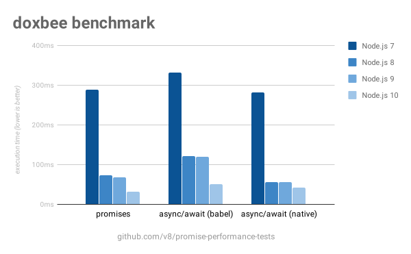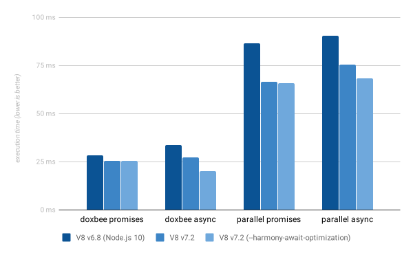 上图是 doxbee benchmark,它评估了 Promise 的性能。请注意,图表中的执行时间越低意味着性能越好。