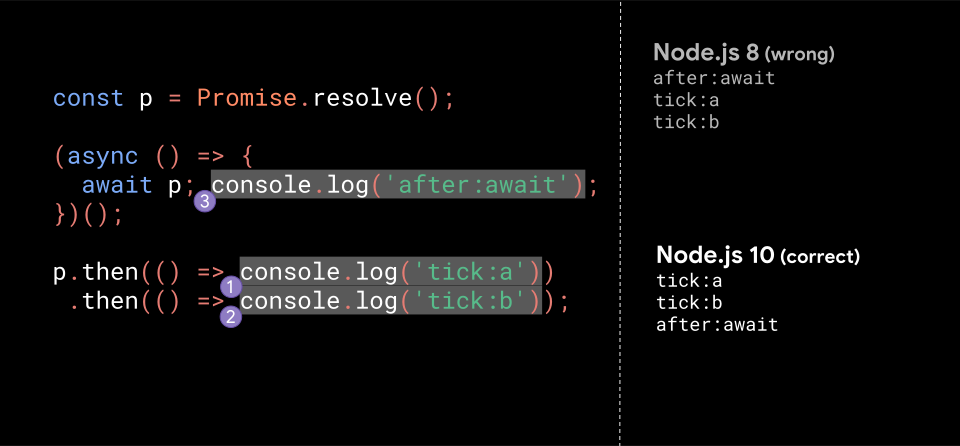 最后,虽然放在后面但是并非不重要,Node.js 8 中有一个 bug 导致 await 在某些情况下跳过 microticks,从而产生更好的性能。这个 bug 的原因是我们违反了 es 的规范,但它后来给了我们关于优化的灵感。让我们从有缺陷的行为开始: