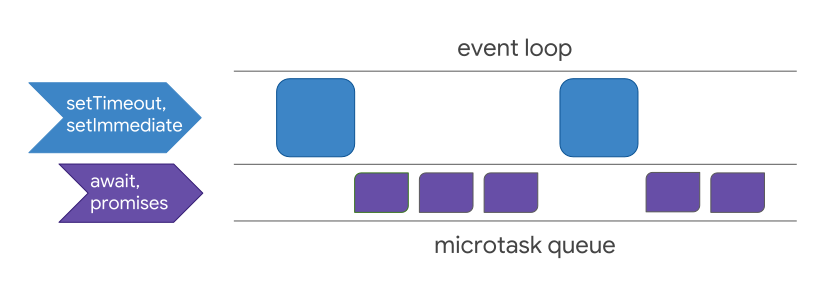 在高层次上,JavaScript 中有 task 和 microtask。task 用于处理 I/O 和计时器等事件,每次执行一个。microtask 为 async/await 和 Promise 实现延迟执行,并在每个 task 结束时执行。在每一个事件循环之前,microtask 队列总是被清空(执行)。