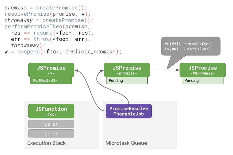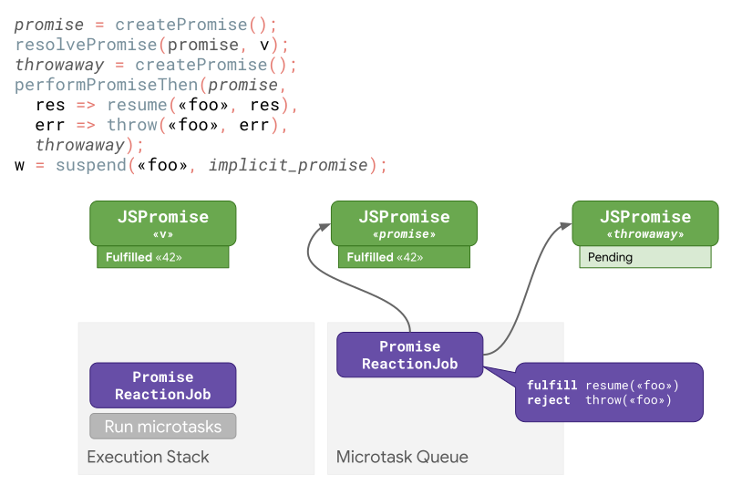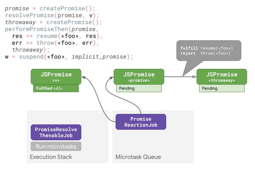 然后引擎创造了另一个所谓的 throwaway Promise。它被称为 throwaway,因为它的 then 链没有任何处理程序 - 它完全在引擎内部。此 throwaway 然后被链接到 promise,使用适当的处理程序来恢复异步函数。这个 performPromiseThen 操作基本上就是 Promise.prototype.then() 的幕后操作。最后,暂停执行异步函数,并且控制权返回给调用者。
