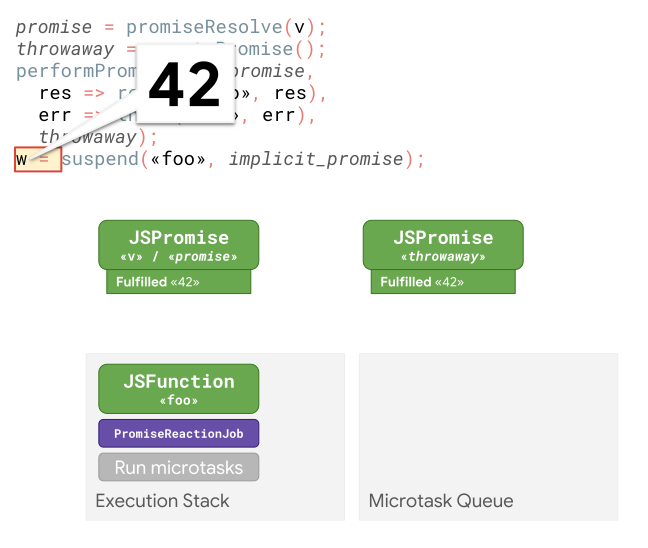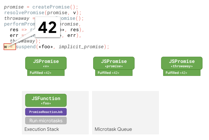 让我们再次假设我们 await 后面的 Promise 返回了 42。感谢 promiseResolve 带来的魔法,现在 promise 指向了同一个 Promise v,所以这个步骤什么也不需要做。然后引擎继续像以前一样,创建
