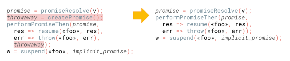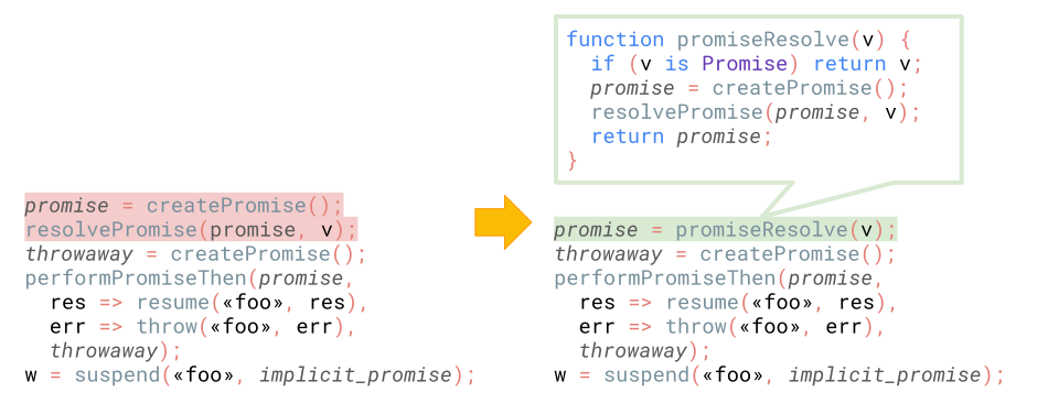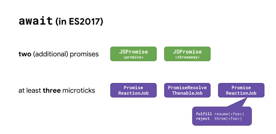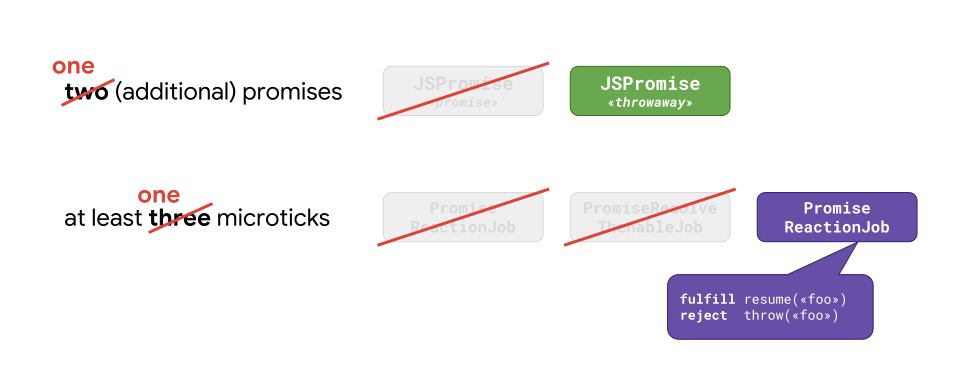 我们来看看这些开销来自哪里。第一行创建了 Promise 包装器。第二行立即使用 await 解析 Promise 包装器 v 的值。这两行导致了另外一个额外的 Promise 和三个 microtick 中的两个。如果 v 已经是一个 Promise(这是常见的情况,因为应用程序通常会在 Promise 上调用 await),这是非常昂贵的。在开发者不常使用的情况下,例如 await 42,引擎仍然需要为其创建