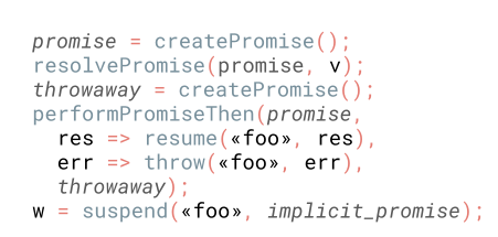 然后是有趣的一点:实际的 await。首先,传递给 await 的值被包裹在一个 Promise 中。然后,处理程序附加到这个包装的 Promise,以便在 Promise 变为 fulfilled 后恢复该函数,并且暂停执行异步函数,并将 implicit_promise 返回给调用者。一旦 promise 变为 fulfilled,恢复异步函数的执行,并将 promise 的值赋值给 w,而且这个 w 也是 implicit_promise 被 resolved 后的值。