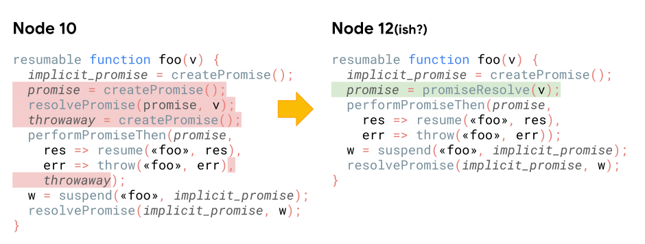 此操作返回没有修改过的 promise,并且只在必要时将其值包装到 promise 中。当传递给 await 的值已经是一个 Promise 时,这可以节省其中一个额外的 promise,加上 microtick 队列上的两个 tick。从 V8 v7.1 开始,该行为可以通过 V8 的命令行参数 --harmony-await-optimization 开启。我们也提交了对 proposed this change to the ECMAScript specification 的变更;一旦我们确定它与 Web 兼容,这个补丁就会合并到提案中。