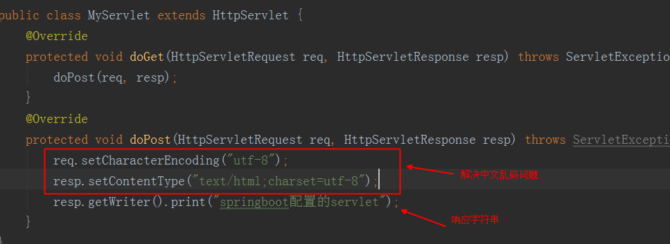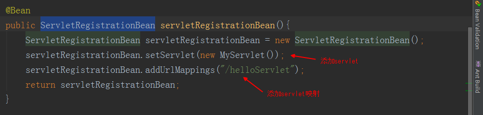 现在的springboot配置servlet,也差不多,写个servlet,但是记住,springboot不能直接识别servlet,需要借助一个工具ServletRegistrationBean(xxxBean在学spring的时候应该很常见,本质上还是一个Bean,但是有能够生产bean的能力,类似一个简单的工厂类)
