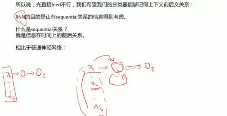 这里有一个问题,如果你把每个单字作为模型输入的话,你把x1,x2,x3输入分类器,而分类器每次只能处理一个x。例如当你输入"你",我告诉你下一个字是"瞅",你告诉我"瞅",我告诉你下一个字是"啥",你告诉我"啥",我告诉你"瞅你咋地?!",用人的思维想就知道,这是不可能的,因为歧义太多了,如果我们是一个一个塞进我们的分类器的话,他们之间的关系是不能被保证的,不知道整个语境有多长,不知道语境下面它到底是什么意思,这时我们需要一种带记忆的神经网络来解决这个问题。