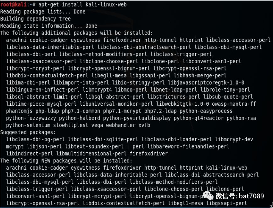6. 尽管Kali附带了一套很好的预先安装的工具,但是它的软件存储库中还包括一些其他的工具,但默认情况下是不安装的。为了确保我们拥有web应用程序渗透测试所需的一切,我们通过输入apt-get installkali-linux-web命令来安装kali-linux-web测试包: