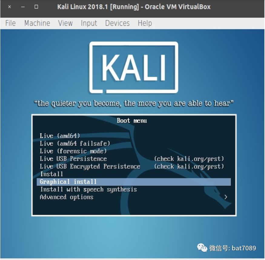 7. 我们已经创建了一个虚拟机,但是我们仍然需要安装操作系统。启动虚拟机,它将使用我们配置为虚拟CD/DVD的Kali映像启动。使用箭头选择图形安装和按回车: