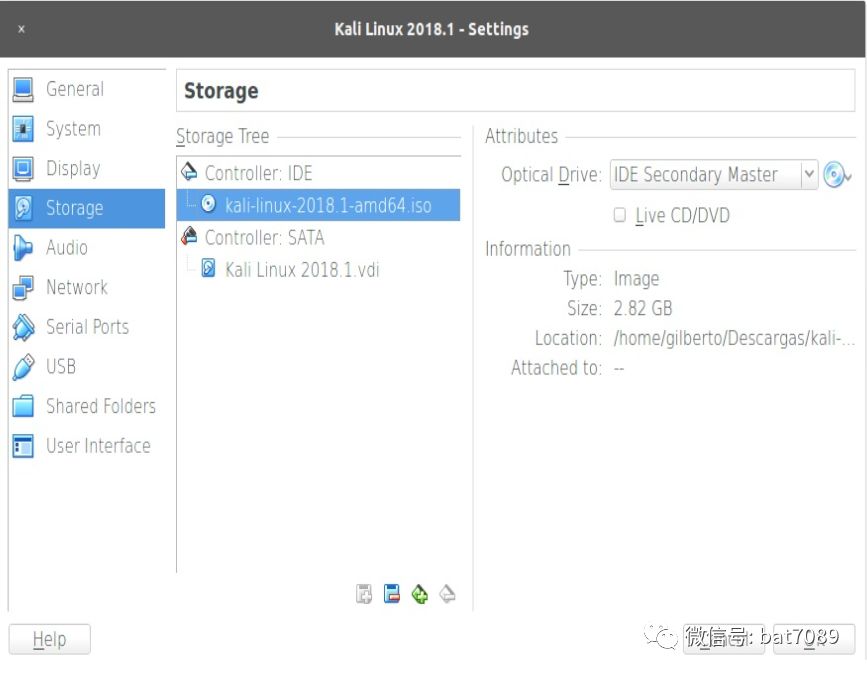 6. 创建虚拟机之后,选择它并单击Settings,然后转到Storage并选择Controller: IDE下的CD图标。在属性面板中,单击CD图标,选择“虚拟光盘文件”,浏览从官方页面下载的Kali图像。然后单击OK: