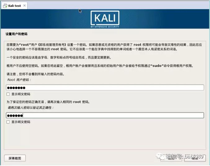9. 之后,您将被要求输入root密码;在基于unix的系统中,root是最高管理员账户,在Kali中,它是默认的登录帐户。设置密码,确认,点击继续: