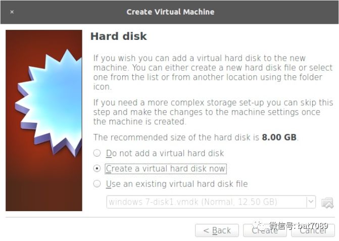 4. 我们单击Next进入硬盘设置,选择“现在创建虚拟硬盘”,然后点击创建,在主机文件系统中创建新的虚拟磁盘文件: