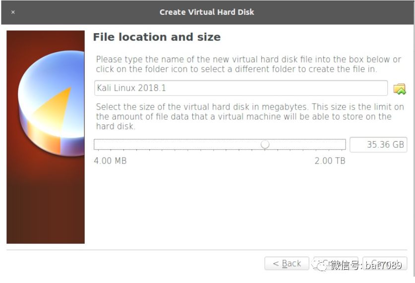 l 接下来,我们需要选择文件存储在主机文件系统中的位置和它们的最大容量;这是虚拟操作系统的存储容量。我们保留默认位置,选择35.36 GB大小。这取决于你的基础机器的资源,但是为了安装必需的工具,至少应该是20GB。现在,点击创建: