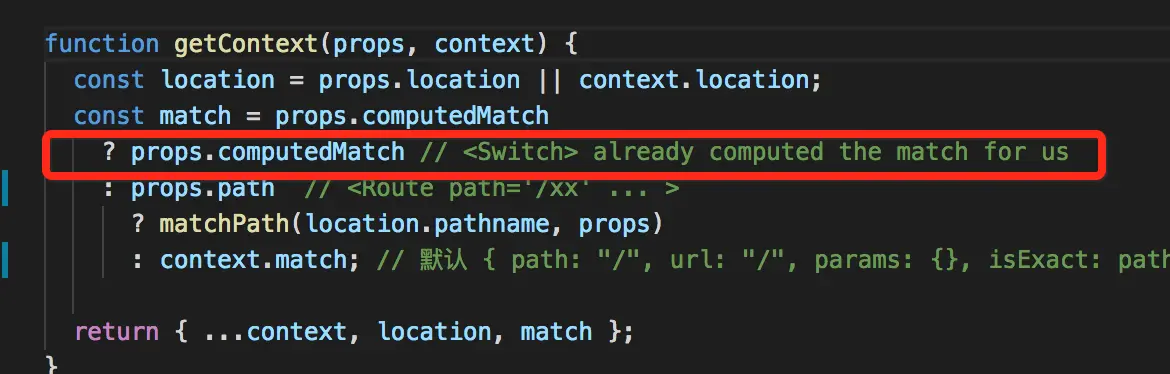 这就是Switch组件渲染与位置匹配的第一个子组件Route或Redirect的原因。Switch利用React.Children.forEach(this.props.children, child => {...})方法匹配第一个子组件, 如果匹配成功添加computedMatch props,props值为match。从而改变了matchPath的逻辑