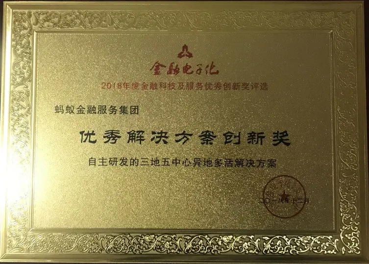 12月20日,在北京举行的“2018中国金融科技年会暨金融科技及服务优秀奖颁奖典礼”正式宣布蚂蚁金服自主研发的三地五中心异地多活解决方案获“2018年度金融科技优秀解决方案创新奖”。