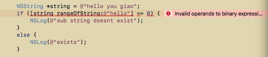 本着菜鸟的探究精神,发现 NSString.h 中还有一个查找字符串中是否包含字符串的方法 - (NSRange)rangeOfString:(NSString *)searchString; 迫不及待试了一下,果然事情没那么顺利,出现了报错: