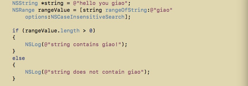 我们可以为 - (NSRange)rangeOfString:(NSString *)searchString; 添加一些搜索的 options(条件) ,例如 - (NSRange)rangeOfString:(NSString *)searchString options:(NSStringCompareOptions)mask;