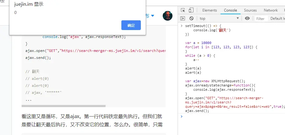 那怎么办呢。我们找到了小明,小明把cosnole.log('翻天')放到了代码的最后面。执行一下。发现居然还是比ajax先执行...