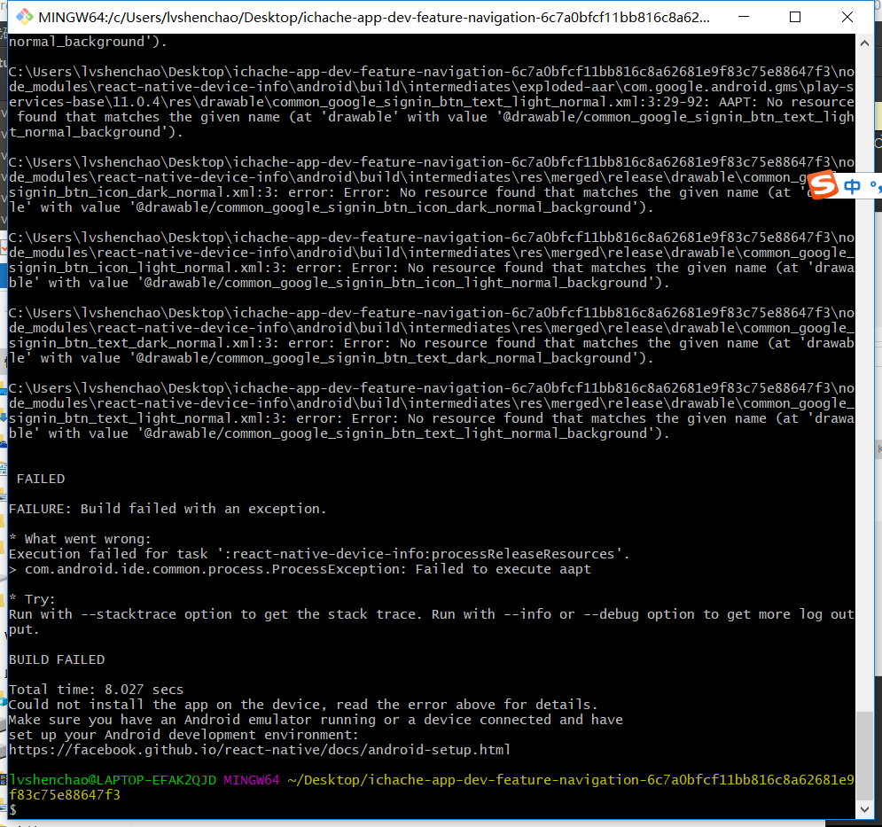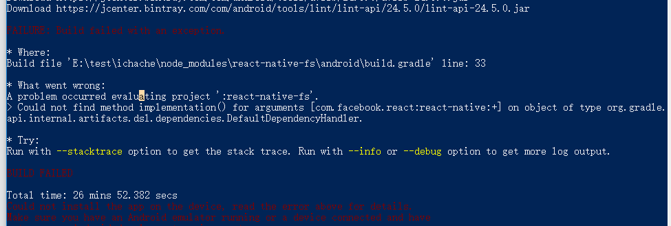 图中报react-native-fs的组件的问题,里面的implementation这个方法报错 implementation()是安卓的新语法,不兼容,你只要把implementation换乘compile就行了, 在AS中会报错,你不用管,AS其实就是为了提供一些插件什么的,不要用高版本的AS调试你们的这个项目,