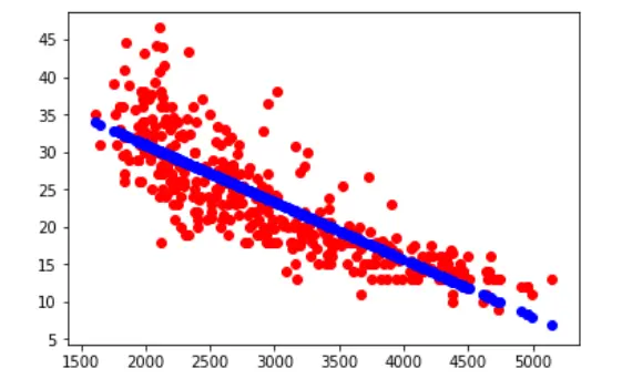 plt.scatter(cars["weight"], cars["mpg"], c='red') plt.scatter(cars["weight"], predictions, c='blue') plt.show()