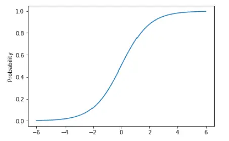 import numpy as np # Logit Function def logit(x): # np.exp(x) raises x to the exponential power, ie e^x. e ~= 2.71828 return np.exp(x) / (1 + np.exp(x)) # Generate 50 real values, evenly spaced, between -6 and 6. x = np.linspace(-6,6,50, dtype=float) # Transform each number in t using the logit function. y = logit(x) # Plot the resulting data. plt.plot(x, y) plt.ylabel("Probability") plt.show()