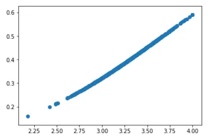 logistic_model = LogisticRegression() logistic_model.fit(admissions[["gpa"]], admissions["admit"]) pred_probs = logistic_model.predict_proba(admissions[["gpa"]]) print(pred_probs) ## pred_probs[:,1] 接收的可能性 pred_probs[:,0] 没有被接收的可能性 plt.scatter(admissions["gpa"], pred_probs[:,1]) plt.show()