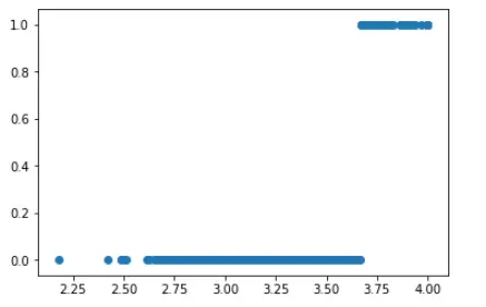 import pandas as pd import matplotlib.pyplot as plt admissions = pd.read_csv("C:\\ML\\MLData\\admissions.csv") print (admissions.head()) plt.scatter(admissions['gpa'], admissions['admit']) plt.show() admit gpa gre 0 0 3.177277 594.102992 1 0 3.412655 631.528607 2 0 2.728097 553.714399 3 0 3.093559 551.089985 4 0 3.141923 537.184894 <Figure size 640x480 with 1 Axes> -