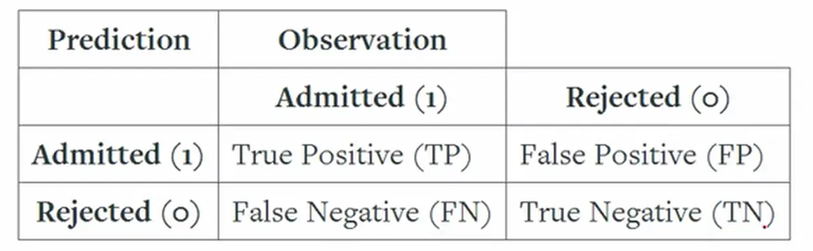 model = LogisticRegression() model.fit(train[["gpa"]], train["actual_label"]) labels = model.predict(test[["gpa"]]) test["predicted_label"] = labels matches = test["predicted_label"] == test["actual_label"] correct_predictions = test[matches] accuracy = len(correct_predictions) / len(test) true_positive_filter = (test["predicted_label"] == 1) & (test["actual_label"] == 1) true_positives = len(test[true_positive_filter]) false_negative_filter = (test["predicted_label"] == 0) & (test["actual_label"] == 1) false_negatives = len(test[false_negative_filter]) sensitivity = true_positives / float((true_positives + false_negatives)) print(sensitivity) false_positive_filter = (test["predicted_label"] == 1) & (test["actual_label"] == 0) false_positives = len(test[false_positive_filter]) true_negative_filter = (test["predicted_label"] == 0) & (test["actual_label"] == 0) true_negatives = len(test[true_negative_filter]) specificity = (true_negatives) / float((false_positives + true_negatives)) print(specificity) -