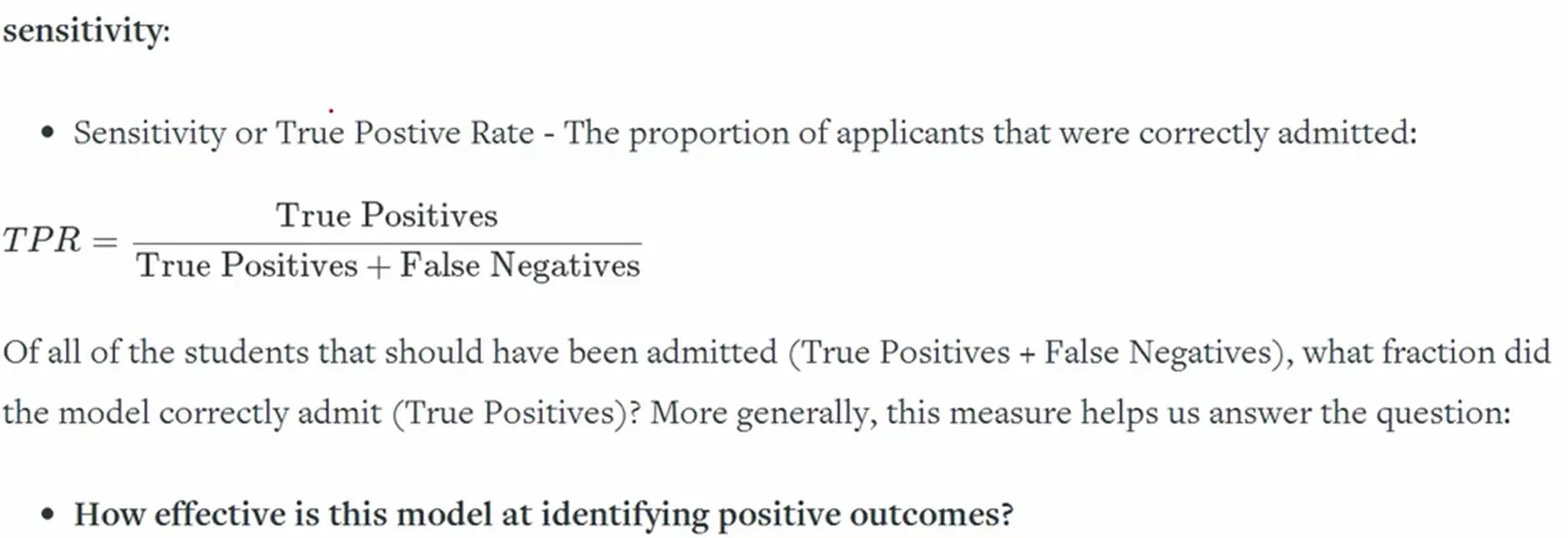 true_positive_filter = (admissions["predicted_label"] == 1) & (admissions["actual_label"] == 1) true_positives = len(admissions[true_positive_filter]) true_negative_filter = (admissions["predicted_label"] == 0) & (admissions["actual_label"] == 0) true_negatives = len(admissions[true_negative_filter]) print(true_positives) print(true_negatives) 31 385 true_positive_filter = (admissions["predicted_label"] == 1) & (admissions["actual_label"] == 1) true_positives = len(admissions[true_positive_filter]) false_negative_filter = (admissions["predicted_label"] == 0) & (admissions["actual_label"] == 1) false_negatives = len(admissions[false_negative_filter]) sensitivity = true_positives / float((true_positives + false_negatives)) print(sensitivity) 0.127049180328 -