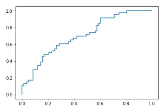 import matplotlib.pyplot as plt from sklearn import metrics # 看面积(综合评价指标) probabilities = model.predict_proba(test[["gpa"]]) fpr, tpr, thresholds = metrics.roc_curve(test["actual_label"], probabilities[:,1]) print(fpr) print(tpr) print (thresholds) plt.plot(fpr, tpr) plt.show() [0. 0. 0. 0.01204819 0.01204819 0.03614458 0.03614458 0.04819277 0.04819277 0.08433735 0.08433735 0.12048193 0.12048193 0.14457831 0.14457831 0.15662651 0.15662651 0.1686747 0.1686747 0.20481928 0.20481928 0.22891566 0.22891566 0.25301205 0.25301205 0.26506024 0.26506024 0.28915663 0.28915663 0.36144578 0.36144578 0.37349398 0.37349398 0.39759036 0.39759036 0.42168675 0.42168675 0.4939759 0.4939759 0.51807229 0.51807229 0.56626506 0.56626506 0.57831325 0.57831325 0.59036145 0.59036145 0.60240964 0.60240964 0.71084337 0.71084337 0.74698795 0.74698795 0.80722892 0.80722892 1. ] [0. 0.04347826 0.10869565 0.10869565 0.13043478 0.13043478 0.15217391 0.15217391 0.17391304 0.17391304 0.30434783 0.30434783 0.34782609 0.34782609 0.39130435 0.39130435 0.45652174 0.45652174 0.47826087 0.47826087 0.5 0.5 0.52173913 0.52173913 0.54347826 0.54347826 0.58695652 0.58695652 0.60869565 0.60869565 0.63043478 0.63043478 0.65217391 0.65217391 0.67391304 0.67391304 0.69565217 0.69565217 0.7173913 0.7173913 0.73913043 0.73913043 0.76086957 0.76086957 0.82608696 0.82608696 0.84782609 0.84782609 0.91304348 0.91304348 0.95652174 0.95652174 0.97826087 0.97826087 1. 1. ] [1.56004565 0.56004565 0.54243179 0.53628712 0.51105566 0.48893268 0.48527053 0.48509715 0.4813168 0.46947103 0.45346756 0.44834885 0.44706728 0.44427478 0.43934894 0.43829984 0.43663204 0.43619054 0.43403896 0.42768342 0.42552944 0.42037834 0.41902425 0.4106753 0.40808302 0.40553849 0.40263935 0.39614129 0.39051837 0.3829498 0.38157447 0.38068362 0.38048866 0.37569719 0.37508847 0.37197763 0.36994072 0.36246461 0.36217119 0.36104391 0.36079299 0.3545887 0.354584 0.35222722 0.35015605 0.34812221 0.34735443 0.34725692 0.34146873 0.32738061 0.32312995 0.32262176 0.32259245 0.3058184 0.30278689 0.19267703]