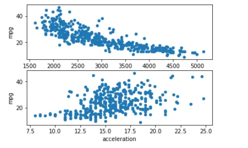 fig = plt.figure() ax1 = fig.add_subplot(2,1,1) ax2 = fig.add_subplot(2,1,2) cars.plot("weight", "mpg", kind='scatter', ax=ax1) cars.plot("acceleration", "mpg", kind='scatter', ax=ax2) plt.show()