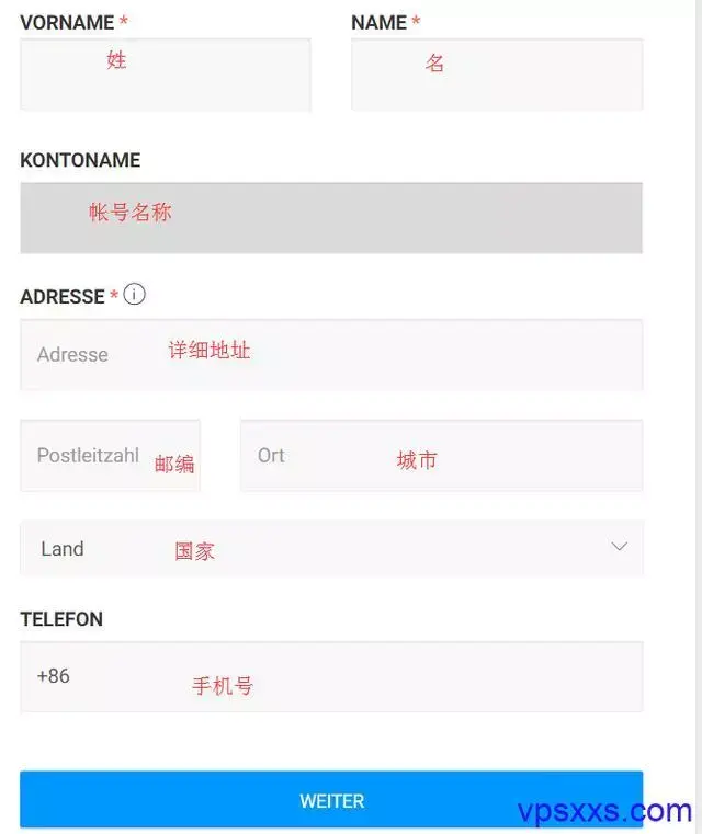 接下来完善账户信息,如果如实填写资料即可,使用拼音,不要乱写,国内手机号前面的+86不要动,然后点击蓝色按钮下一步: