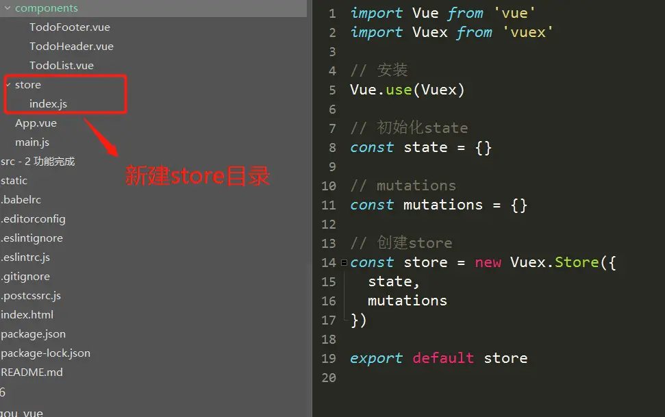 然后我们开始搭建项目,使用vue-cli的步骤,就跳上过了,楼主在vue-admin教程中有详细步骤,现在我们在src目录下新建store文件夹,然后新建index.js文件,然后我们初始化store,代码如下
