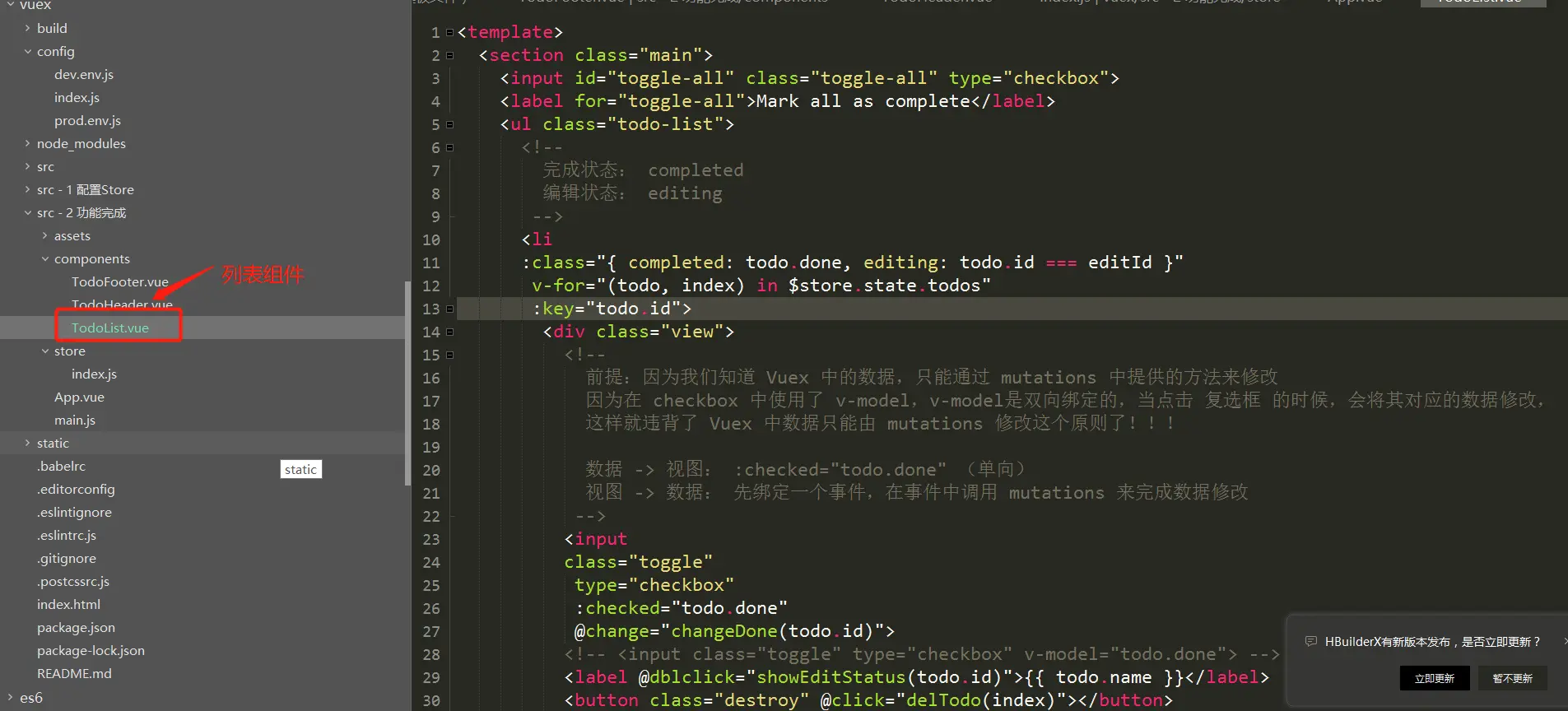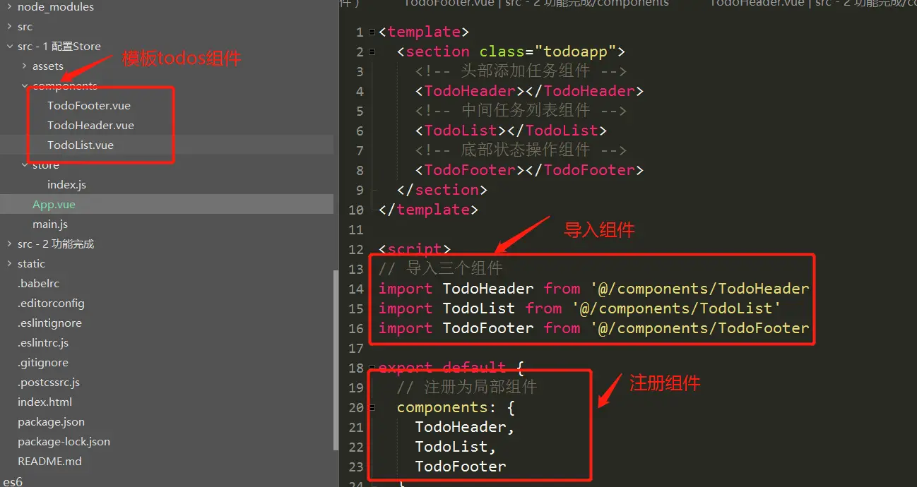 然后配置App.vue,把todos模板组件导入App.vue中,我们的store就配置好了