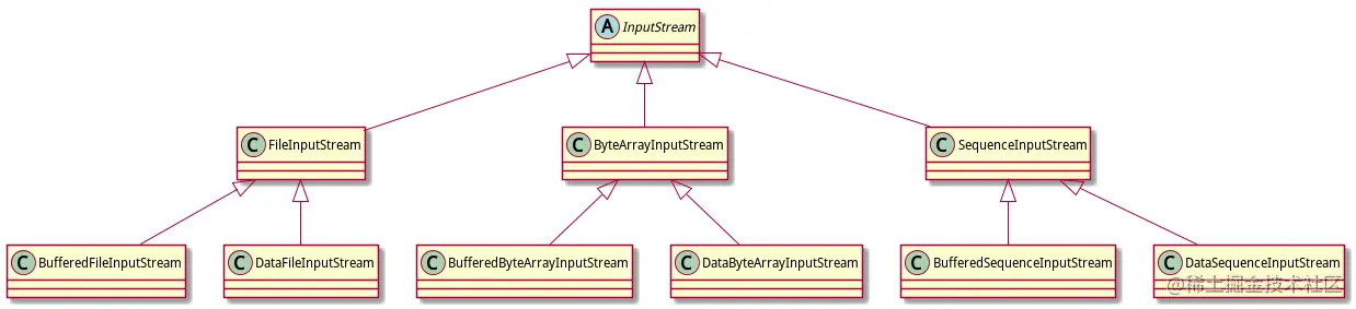 InputStream:[ FileInputStream,ByteArrayInput Stream,SequenceInputStream,ObjectInputream,PipedInputStream,StringBufferInputStream……还包括其他二方、三方继承InputStream自实现的InputStream子类,目前至少有两百多个各种实现]