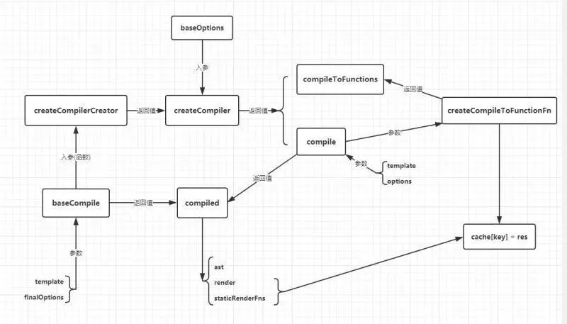 其实 eMount 最后还是去调用的 rMount,只不过在 eMount 做了一定的操作,如果你提供了 render 函数,那么它会直接去调用 rMount,如果没有,它就会去找你有没有提供 template,如果你没有提供 template,它就会用 el 去查询 dom 生成 template,最后通过编译返回了一个 render 函数,再去调用 eMount。 从上面可以看出,最重要的一部分就是 compileToFunctions 这个函数,它最后返回了 render 函数,关于这个函数,它有点复杂,我画了一张图来看一看它的关系,可能会有误差,希望大侠们可以指出。
