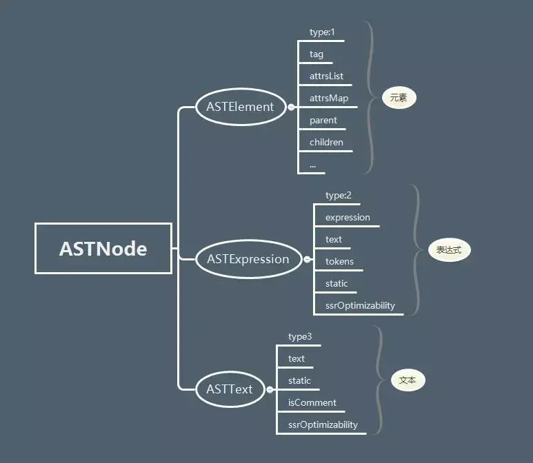 在解析器中有一个非常重要的概念 AST,大家可以去自行了解一下。 在 Vue 中,ASTNode 分几种不同类型,关于 ASTNode 的定义在 flow/compile.js 里面,请看下图: