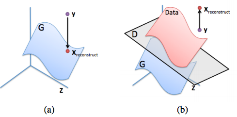 对于部分图片y,对于缺失的像素部分采用最大化D(y)这种看起来合理的做法并不成功,它会导致生成一些既不属于真实数据分布,也属于生成数据分布的像素值。如下图所示,我们需要一种合理的将y映射到生成数据分布上。