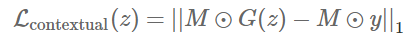 为了保证输入图片相同的上下文信息,需要让输入图片y(可以理解为标签)中已知的像素和对应在G(z)中的像素尽可能相似,因此需要对产生不相似像素的G(z)做出惩罚。该损失函数如下所示,采用的是 L1 正则化方法: