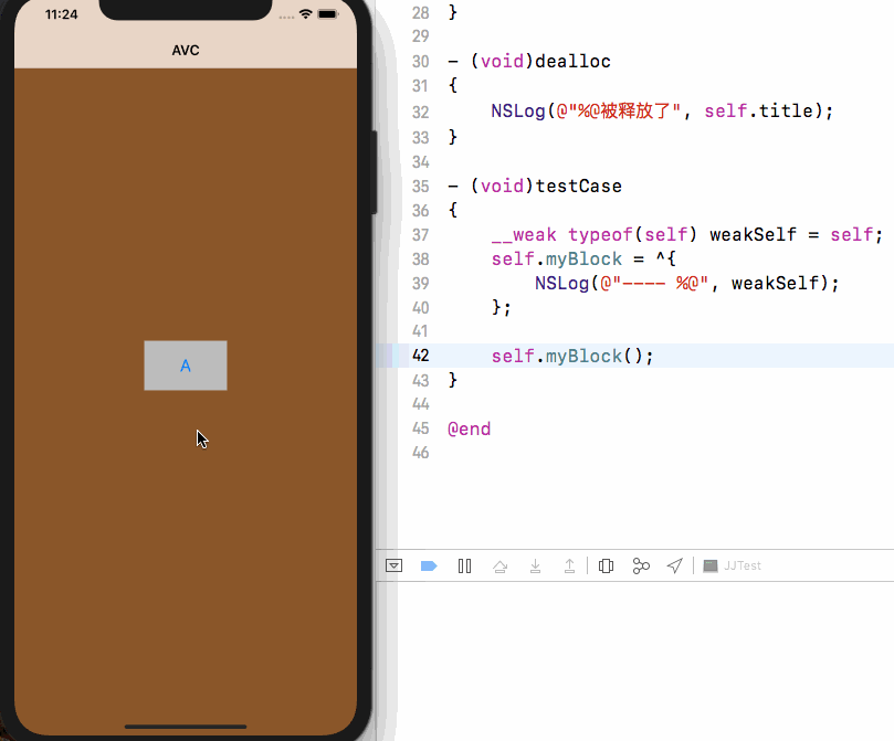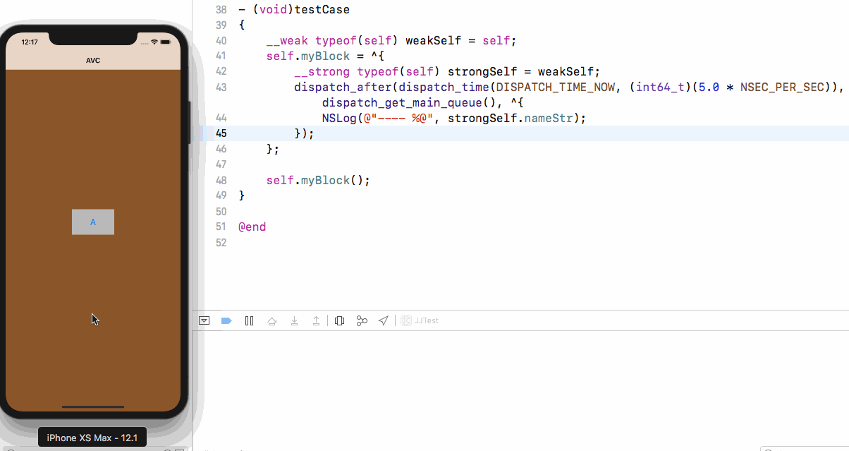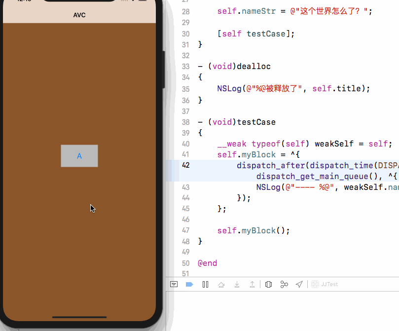 这里大家可以看见,5s内如果pop回去那么weakSelf就是nil,也不能正确打印出字符串了,这个都是正常的,这个类都不要了,也没必要要什么属性了,但是如果我就是想要pop还可以打印出这个属性呢?