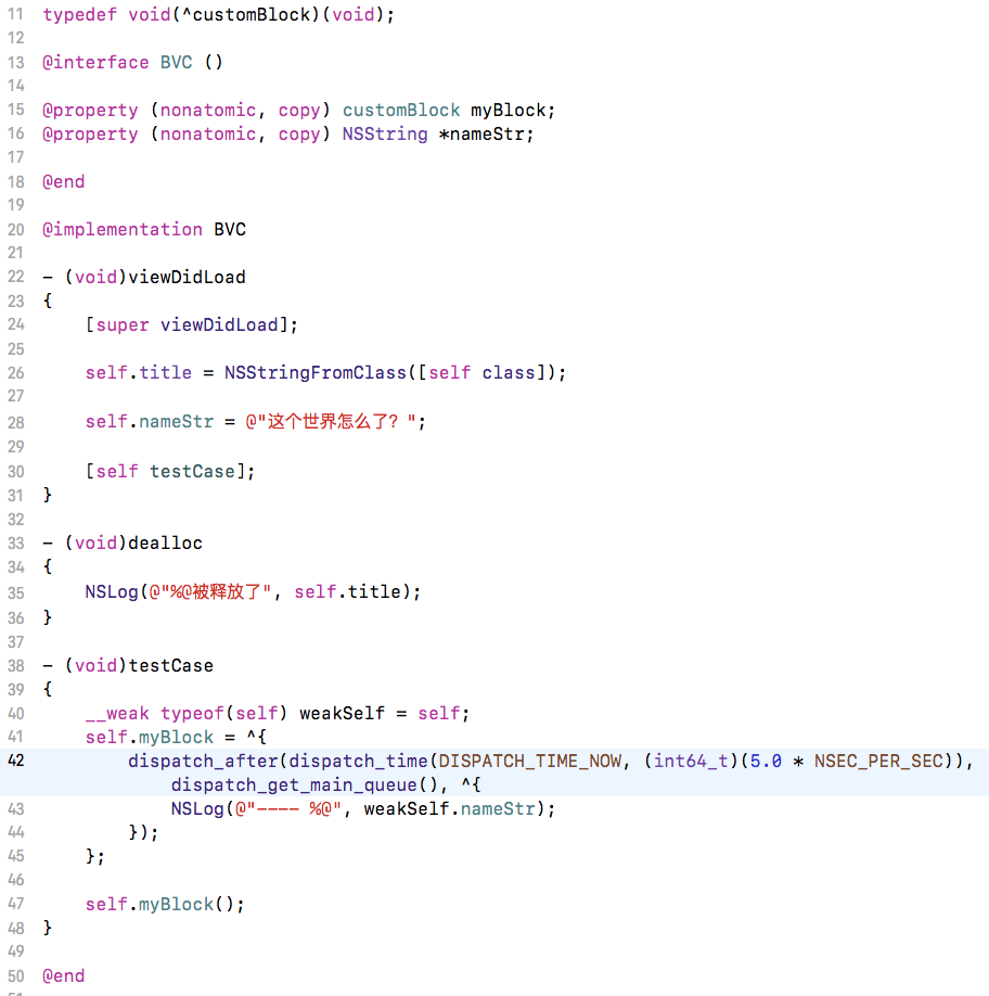 在使用weakSelf弱化self的时候,我们不是所有的block就直接用weakSelf而不区分场景,下面我们看一种场景:那就是在block里面模拟网络延时,接着我们修改下代码,如下所示: