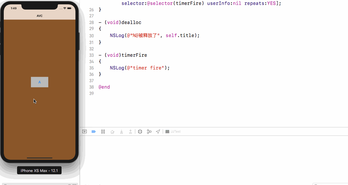 大家可以看到,A push到B,block执行了打出来NSLog,但是pop回到A发现B的析构函数中的XXX被释放了并没有调用,也就是说B没有被释放,造成了内存的泄露。