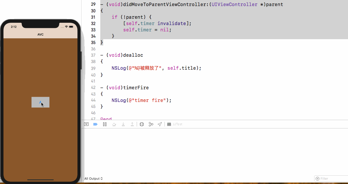 这里应用了parent这个参数,如果是添加到父视图,parent有值,从父视图移除就是nil,所以从Bpop回到A定时器就停掉了,并且调用了析构函数,而B push到C,或者从C pop回到B都不会影响B中的定时器逻辑。