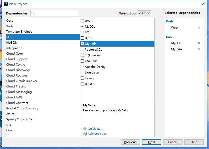 Sping Initializr来创建,如下图Web、MySQL、Mybatis,然后下一步就可以了。(没有连接数据库的话需要把pom.xml中的MySQL先注释掉不然启动会报错)DemoApplication这个是SpingBoot的启动类,其中@SpringBootApplication是一个配置类注解,它的作用像是@Configuration,@EnableAutoConfiguration,@ComponentScan这些注解的组合,@Configuration的作用是允许注册额外的beans,@ComponentScan的作用是启动组件扫描,@EnableAutoConfiguration作用是启动Sping Boot的自动配置。然后我们新建一个