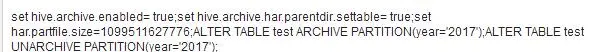 - 在Hive中进行归档处理 Hive支持将已存的分区转换为HAR,从而使得分区下的文件数目大大减少。但是从HAR读数据需要额外的开销,因此查询归档下数据可能会变慢。