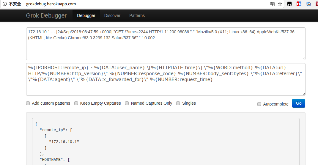 "message": """172.16.10.1 - - [24/Sep/2018:09:04:40 +0000] "GET /?time=2244 HTTP/1.1" 200 98086 "-" "Mozilla/5.0 (X11; Linux x86_64) AppleWebKit/537.36 (KHTML, like Gecko) Chrome/63.0.3239.132 Safari/537.36" "-" 0.002""",
