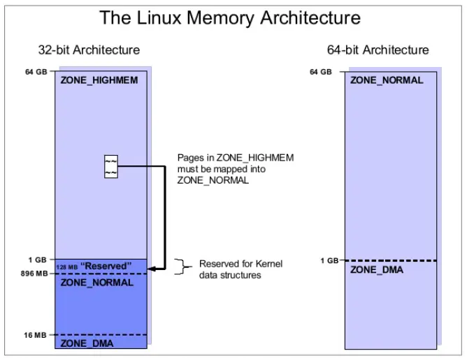32位架构的机器上,Linux内核只能直接映射第一个GB的的物理内存(896M,因为还要考虑到保留的空间)。在此上的内存被称作ZONE_NORMAL,这部分空间必须映射到最下面的1GB。这种映射对应用程序是完全透明的,但是分配内存页到ZONE_HIGHMEM会造成一点 点性能损耗。