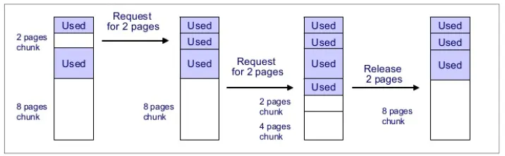 Linux内核使用名为伙伴系统(Buddy system)的机制维护空闲页。伙伴系统维护空闲页面,并且尝试给发来页面申请的进程分配页面,它还努力保持内存区域是连续的。如果不考虑到零散的小页面可能会导致内存碎片,而且在要分配一个连续的大内存页时将变得很困难,这就可能导致内存使用效率降低和性能下降。下图说明了伙伴系统如何分配内存页: