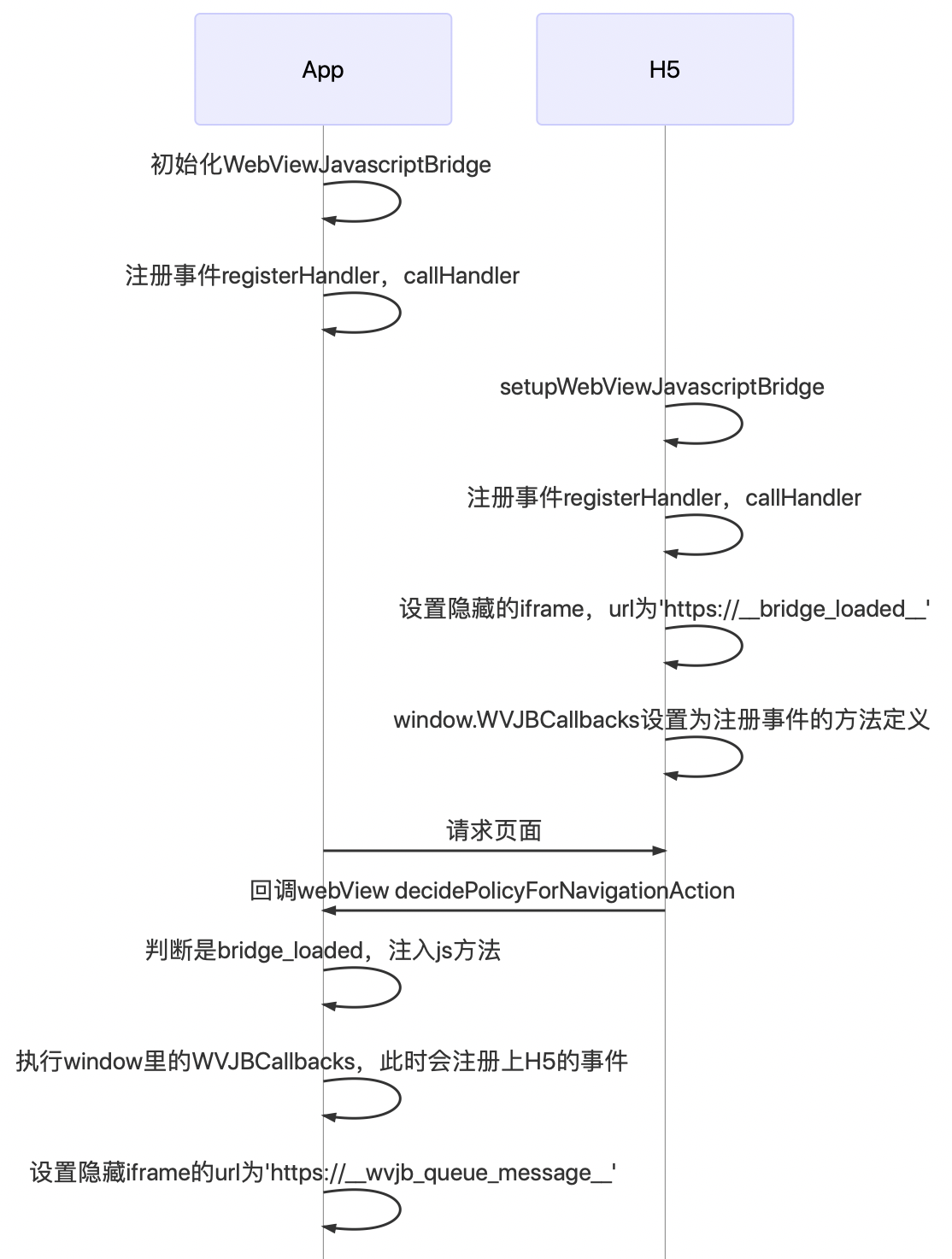 知道如何使用之后,让我们来了解一下它运行的基本流程。主要可以分为三个部分:初始化、App调用H5,JS调用H5。