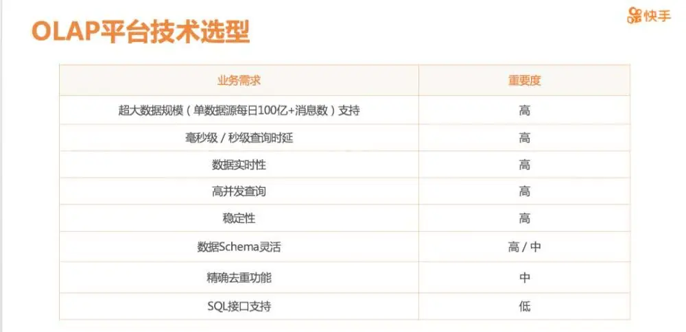 OLAP 平台选型时对公司多个业务团队的需求做了调研,总结来讲,大家对以下几个点关注度会比较高。比如超大数据规模的支持,单个数据源可能每天有上百亿的数据量需要录入;查询时延,要保证在毫秒到秒级;数据实时性,很多业务线明确提出实时数据分析的需求;另外还有高并发查询、平台稳定性等,除此之外还有一些相对权重比较低的需求:如数据 Schema 的灵活变更、精确去重的功能,以及 SQU 接口的支持等。