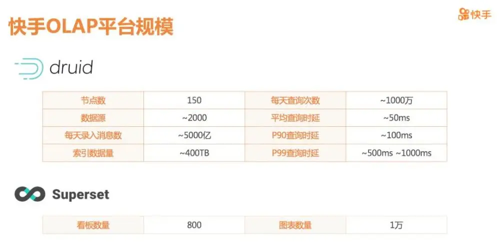 快手 OLAP 平台共有 150 台物理服务器,接入的数据源超过 2000 个,每天录入的消息数量在 5000 亿左右,索引的数据存量约 400TB。每天查询次数峰值 1000 万,这个量是非常大的,但是有很多在程序里触发 API 的调用,人为触发的比例较小。整体上平均查询时延为 50 毫秒,P90 为 100 毫秒左右,P99 为 500 毫秒到 1 秒。可视化方面,积累的用户看板数有八百多个,图表数超过 1 万。